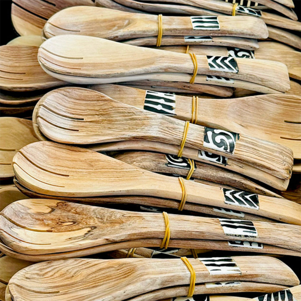 Featuring a decorative inset of cow bone at the handles, each piece is uniquely shaped out of wood using simple hand tools. Note that the pattern will differ slightly on each set.