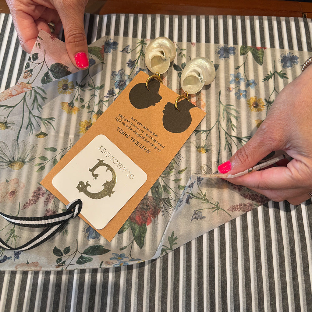 These exquisite earrings are fashioned from genuine conch shells, suspended from a gold metal hoop. Delicate and perfectly imperfect gifts from the ocean, each shell is unique, to be worn with flair and treated with care.