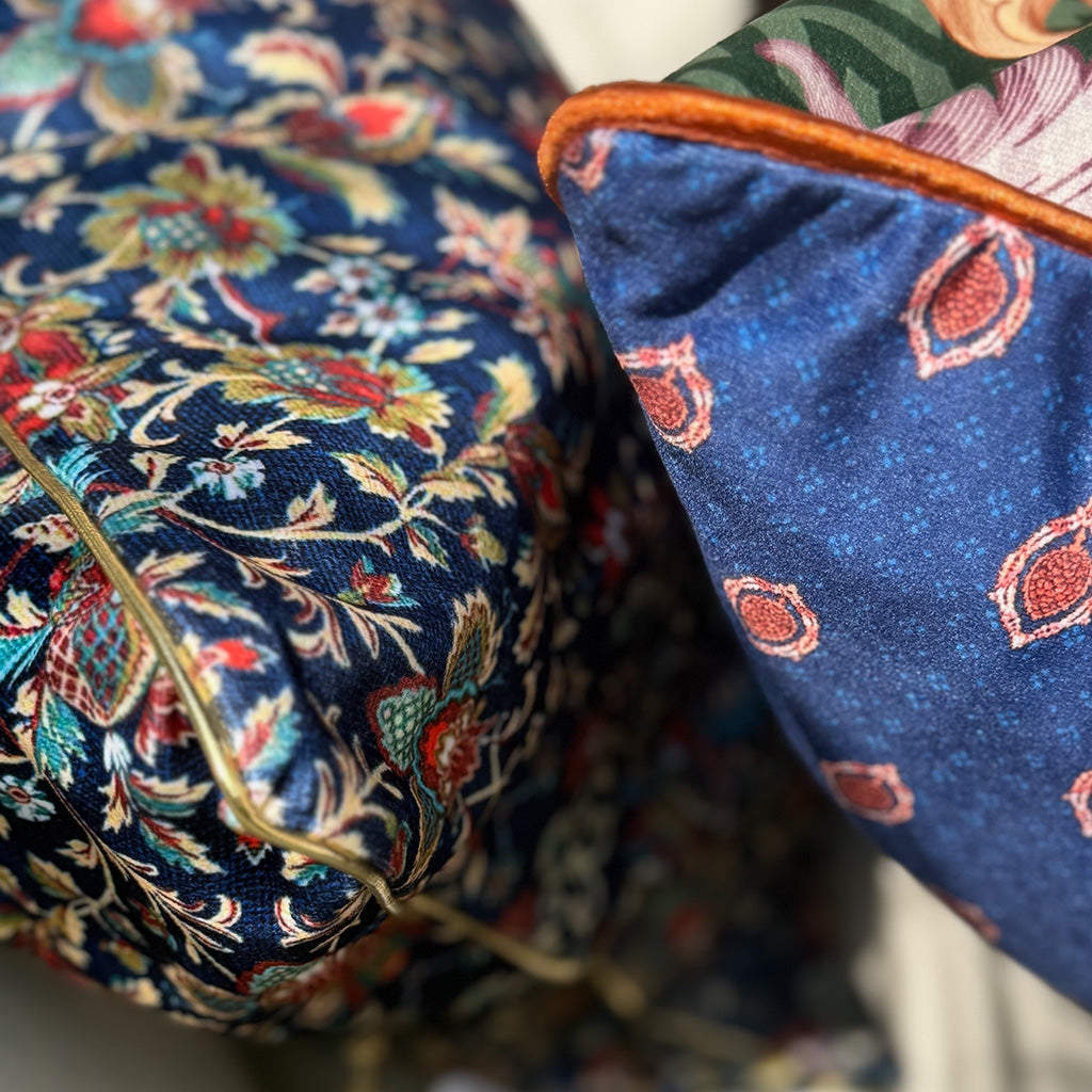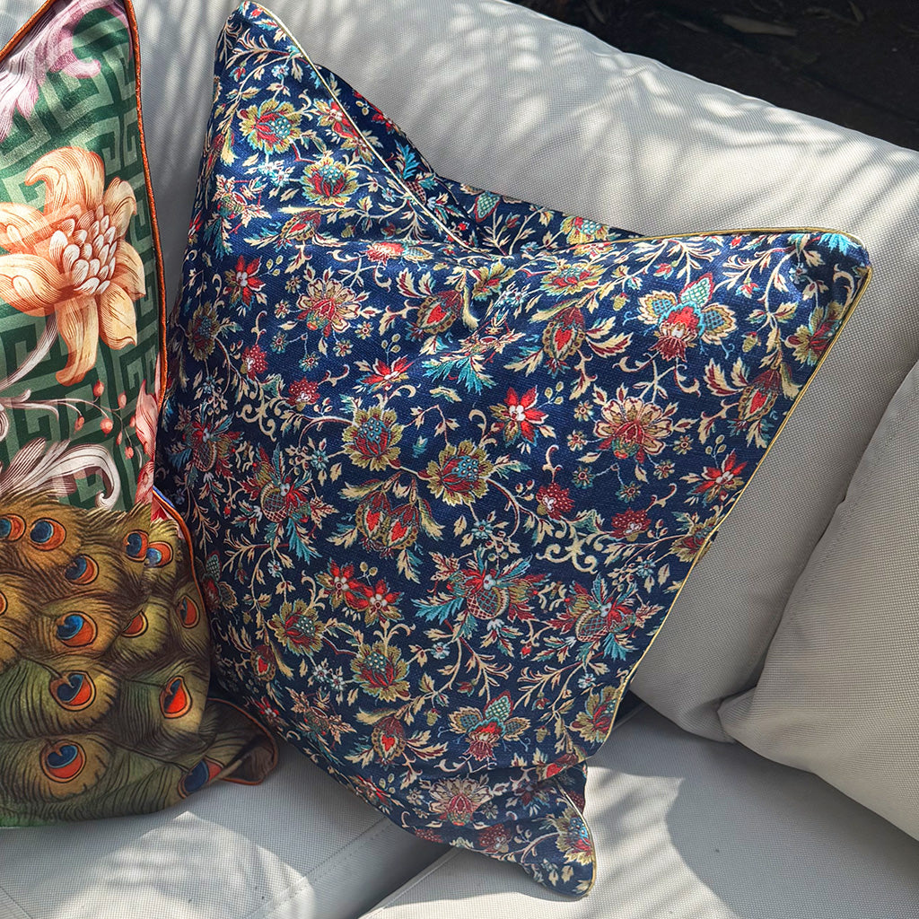 The gold metallic piping that frames the plush velvet canvas adds an extra touch of glamour. A perfect partner for the original print designs in our Birds of a Feather Collection, browse our Stories for styling inspiration.
