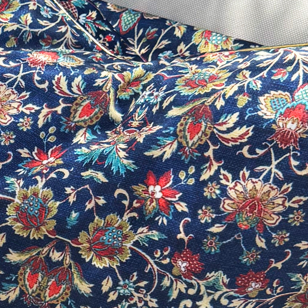 A detailed design that blends an acanthus floral pattern with traditional baroque, in a myriad of rich and regal hues. The print has a graphic filter in the navy background that creates the illusion of texture, but the surface feels soft and smooth to the touch with the subtle shine of velvet.
