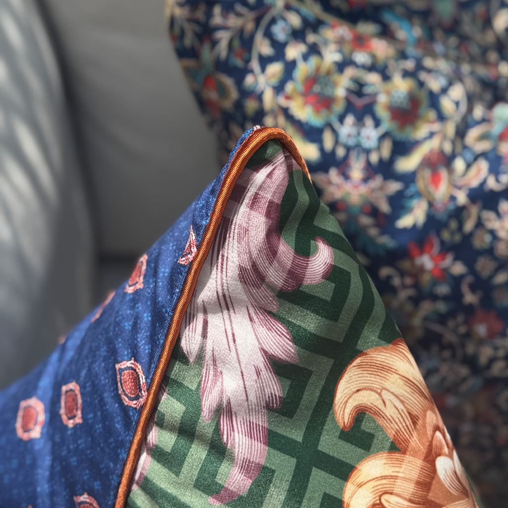 The satin piping that frames the plush velvet canvas adds an extra touch of glamour. Perfectly at home in a luxury setting, or wonderfully juxtaposed with natural elements, browse through the Birds of a Feather Collection in our Stories for styling inspiration.