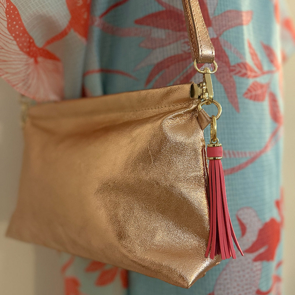 Made from enduring Italian leather in a metallic rose gold or bronze finish and a magnetic opening, each exquisitely classic clutch comes with a different colour detachable tassel keyring embellishment for a little bit of colour and fun.