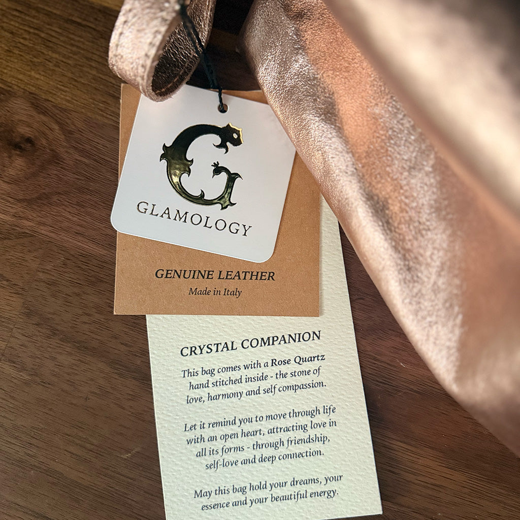 Each bag comes with a Rose Quartz crystal companion hand stitched inside, the stone of love, harmony and self compassion. Let it remind you to move through life with and open heart attracting love in all it's forms, through friendship, self-love and deep connection. May this bag hold your dreams, your essence and your beautiful energy.